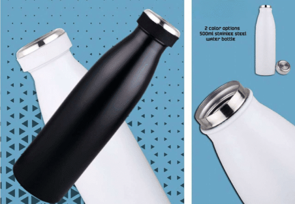 Sleek and durable, this 500ml stainless steel water bottle keeps your drinks hot or cold for hours. Available in classic White and Black, it’s leak-proof, reusable, and perfect for office, gym, travel, or everyday use.